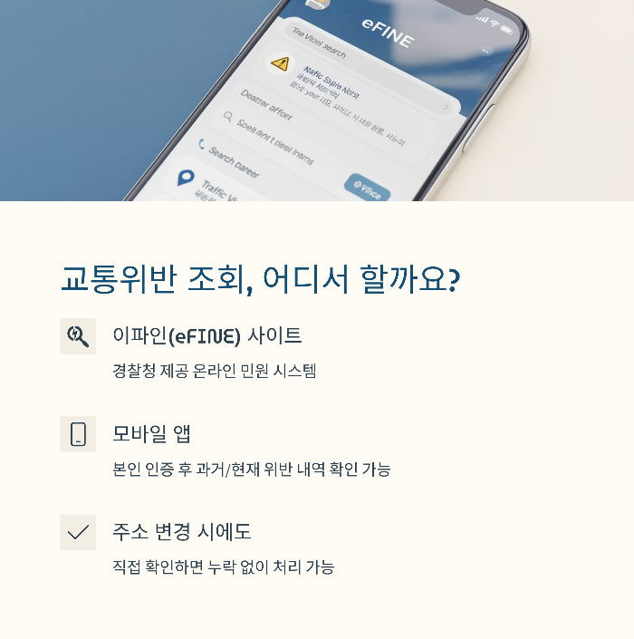 교통위반 사실을 가장 빠르게 확인할 수 있는 방법은 '이파인(eFINE)' 사이트 또는 모바일 앱을 활용하는 것입니다. 이파인은 경찰청에서 제공하는 온라인 민원 시스템으로, 본인 인증만 하면 과거 및 현재의 위반 내역을 조회할 수 있어요. 특히 주소가 바뀌었거나 우편물이 늦게 도착하는 경우, 이파인을 통해 직접 확인하면 누락 없이 처리할 수 있습니다.