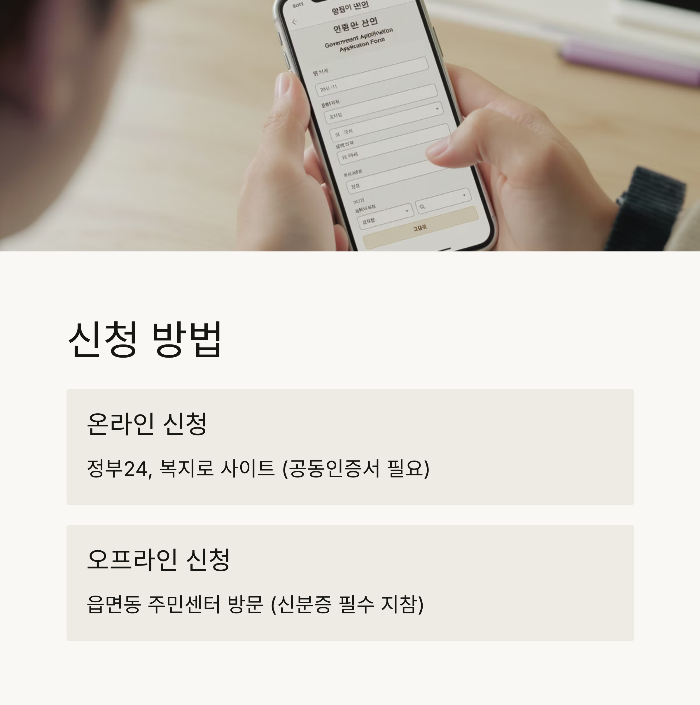 | 오프라인 신청 | 읍면동 주민센터 | 신분증 필수 지참 |
